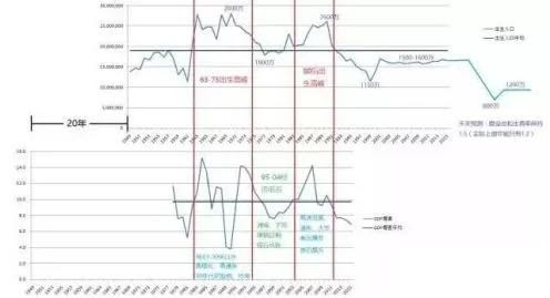 日本的最後一個人口出生高峰是70年代初期,這一時期的高峰人口在90年代初期進入20歲。此後的日本新增年輕人數量便開始了斷崖式下跌,日本經濟也由盛轉衰,進入經濟低迷期。由於此後再無人口高峰來挽救,日本經濟在經歷了20餘年的長期低迷後,並無好轉的跡象,還將持續衰落下去。