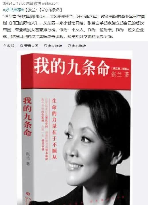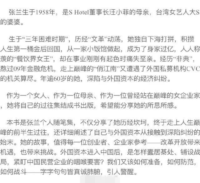 張蘭邀請了周國平、王潮歌等名人好友寫序,汪小菲和大S也分別寫了序言。汪小菲寫道:“我是她的兒子,是她唯一的親人,她辛辛苦苦把我帶大,還是我在事業上的引路人……她大半身都投入于餐飲行業,充滿責任感,也創造了巨大的商業價值和社會價值,是位值得敬佩的企業家。勤儉、勤懇、勤奮,這三點在她身上發揮到了極致。“而大S提到,張蘭最讓她佩服的地方就是身上那份韌性,即使遇到重大打擊仍非常冷靜。大S還直誇張蘭注重儀態、愛漂亮,沒有一天放鬆,沒有一條准許自己萎靡不振,“她是位能屈能伸的女人”。