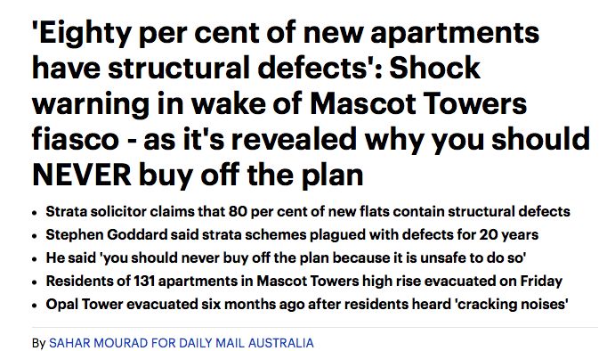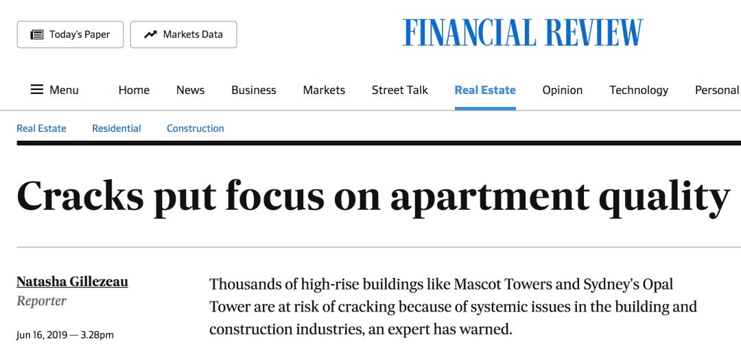 新聞來源:《金融評論報》另一個澳媒也報道了類似的評論:「澳洲80%的新公寓都有建築缺陷!通常會在保修期滿之後才會出現。」