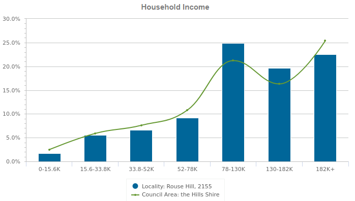 Rouse Hill跨越兩個行政區,Windsor Road以東屬Hills Council(山區市政廳)管轄,以西則屬於Blacktown Council(黑鎮)管轄。西北山區的一些當地居民常以隸屬Hills Council自豪,該區的管理和規劃也確實在悉尼小有名氣,而這點也反映在了房價上。