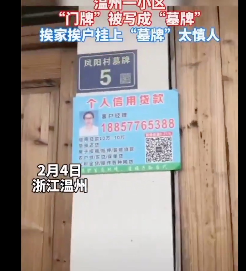 溫州市義小區挨家挨戶「門牌」被寫成「墓牌」。村民們反映,一排過去都寫錯成墓碑了。